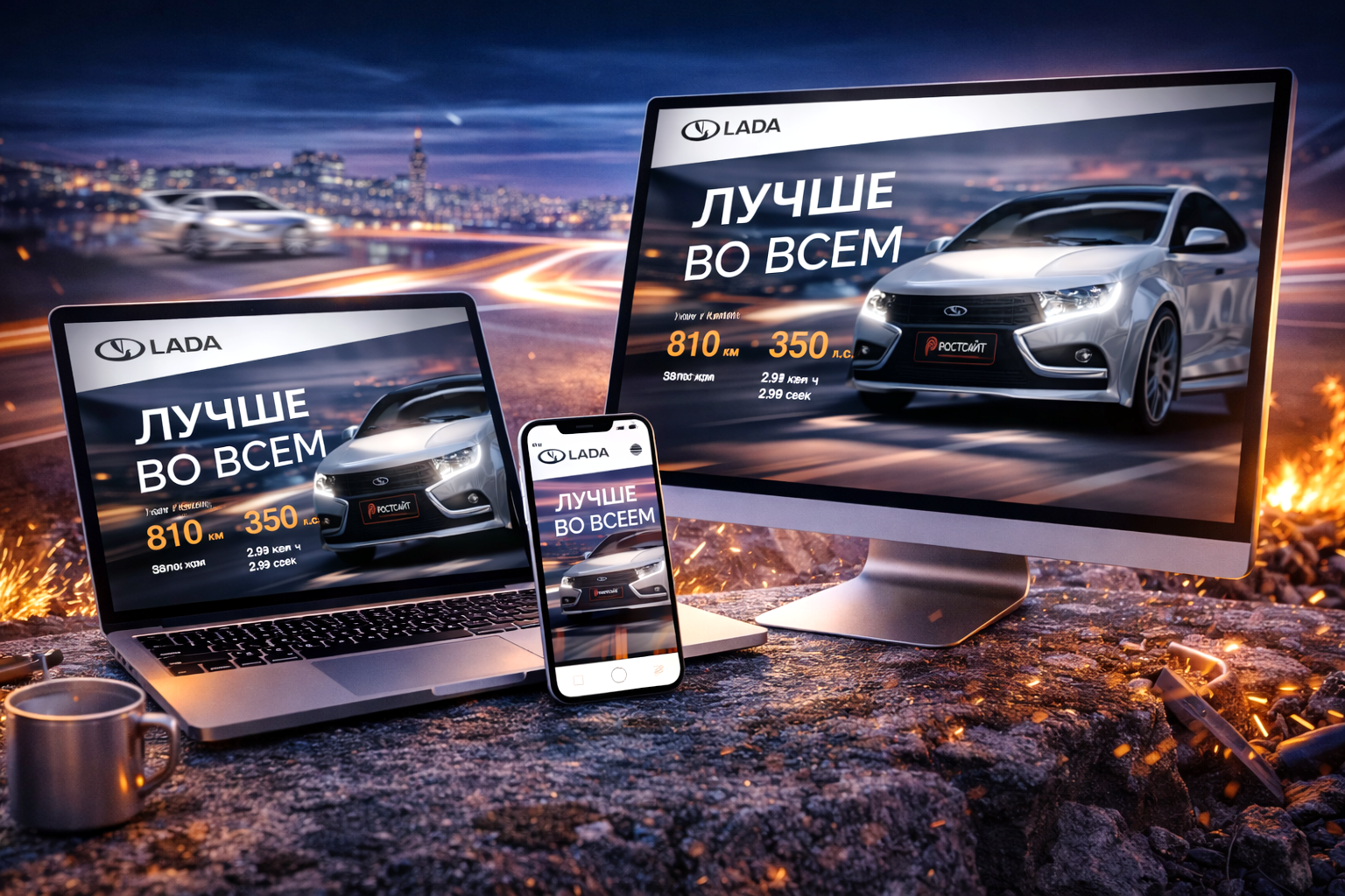 Серебристый силуэт автомобиля на фоне тоннеля — цифровой монумент скорости на Lada.rostsayt.ru. Каждая линия отполирована до блеска. Лучшие сайты для бизнеса показывают, почему дизайн — это часть коммерческой стратегии. Заголовок «ЛУЧШЕ ВО ВСЕМ» — выведен с разрывом, будто громкое объявление в стадионном зале: без сомнений, без оговорок. Под ним — четыре цифры: 810 км, 350 л.с., 390 км/ч, 2.9 сек — технические реплики, переведенные на язык эмоций. Каждая — как показатель на приборной панели гоночного болида: четко, с акцентом на превосходство.